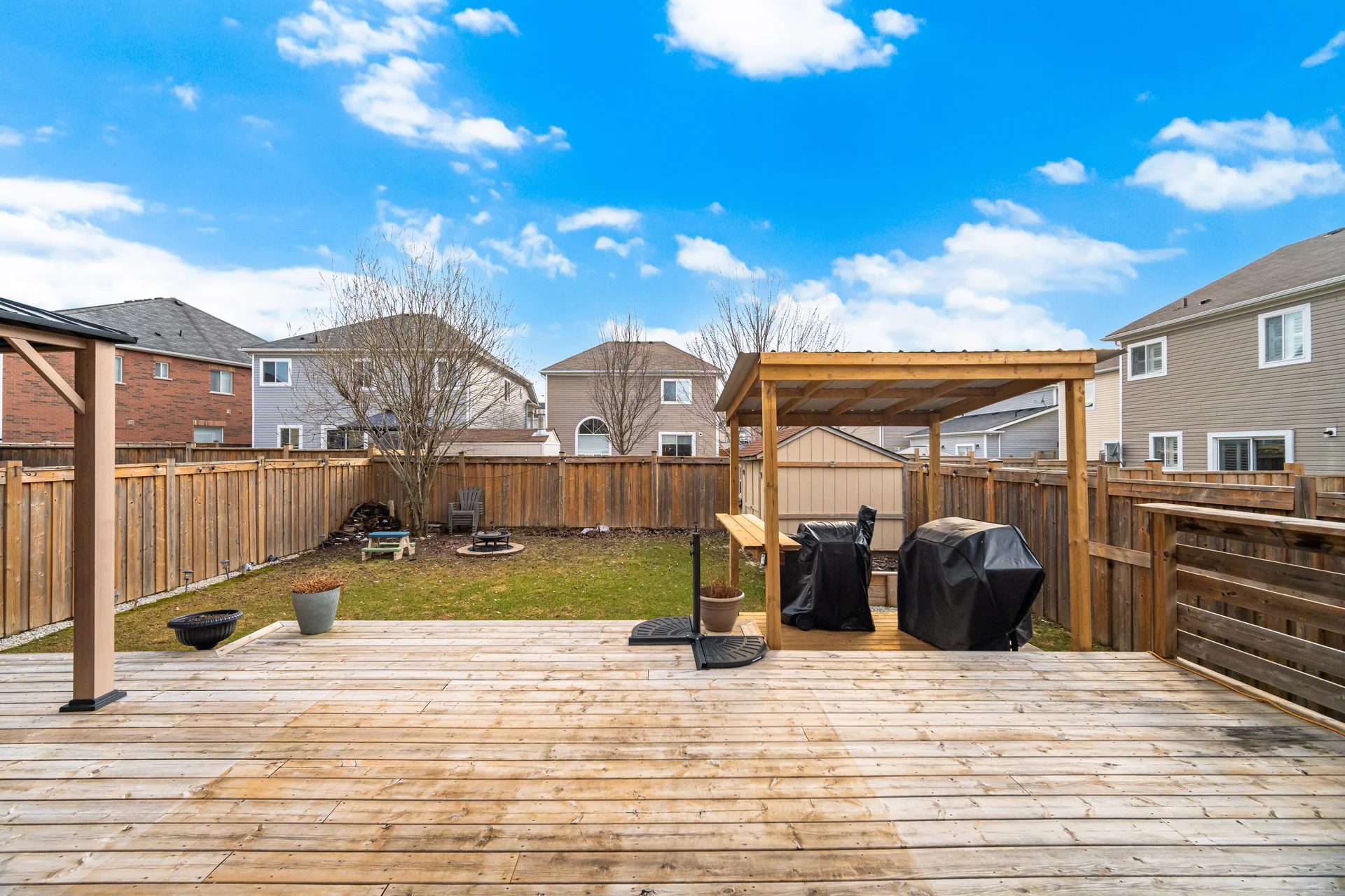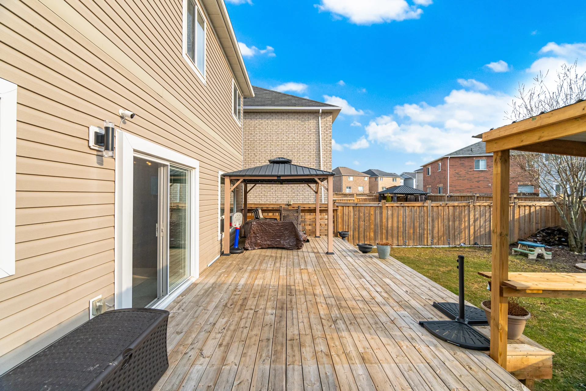 This family-oriented residence is thoughtfully designed, offering a spacious layout. A welcoming entrance features a charming porch and impressive double-door access. Inside, an open-concept layout flows seamlessly to a private outdoor space, complete with a generous deck, a metal gazebo, and a practical storage shed. The upper floor is designed for comfort and practicality, featuring a primary suite with a 5-piece ensuite, a secondary bedroom offering a dedicated reading area, and convenient second-floor laundry facilities. An extended driveway complements the double-car garage, providing substantial capacity for parking and storage needs. This property offers a valuable living environment.